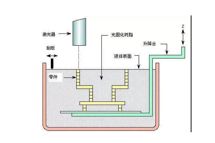 打印之前在樹脂槽中盛滿液態(tài)光敏樹脂,可升降工作臺處于液面下一個截面層厚的高度,聚焦后的激光束在計算機控制下沿液面進行掃描,被掃描的區(qū)域樹脂固化,從而得到該截面的一層樹脂薄片;升降工作臺下降一個層厚距離,液體樹脂再次暴露在光線下,再次掃描固化,如此重復,直到整個產(chǎn)品成型;升降臺升出液體樹脂表面,取出工件,進行相關后處理,通過強光、電鍍、噴漆或著色等處理得到需要的最終產(chǎn)品。